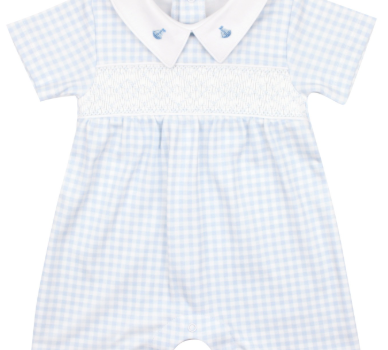 Blue-White gingham romper with white collar and little boats embroidered on collar. Also has snaps on bottom for easy change.