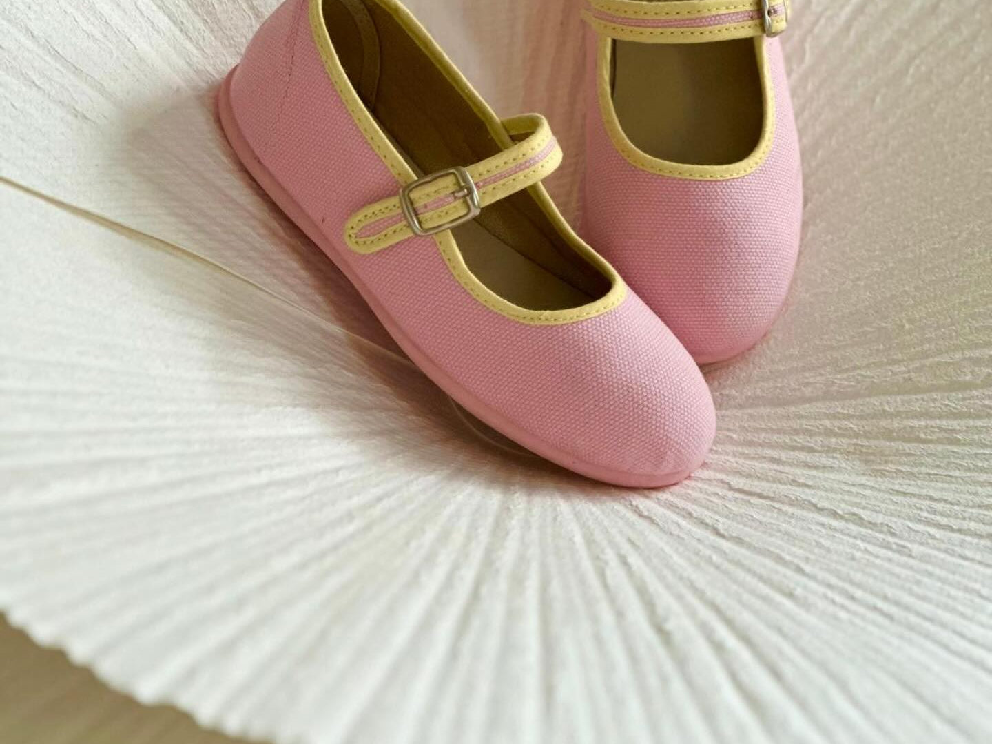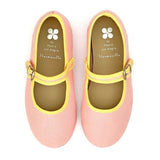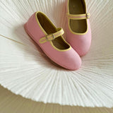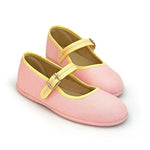 Canvas ballet flat with a non-slip rubber outsole and eco-friendly leather insole. It has a velcro strap, adorned with a decorative buckle, makes it easy to put on.