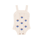 Knitted romper with floral embroidery and wooden buttons on bottom for diaper change.