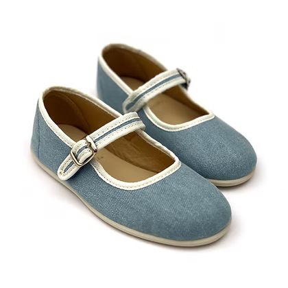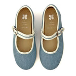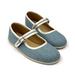 Canvas ballet flat with a non-slip rubber outsole and eco-friendly leather insole. It has a velcro strap, adorned with a decorative buckle, makes it easy to put on.