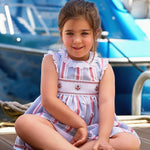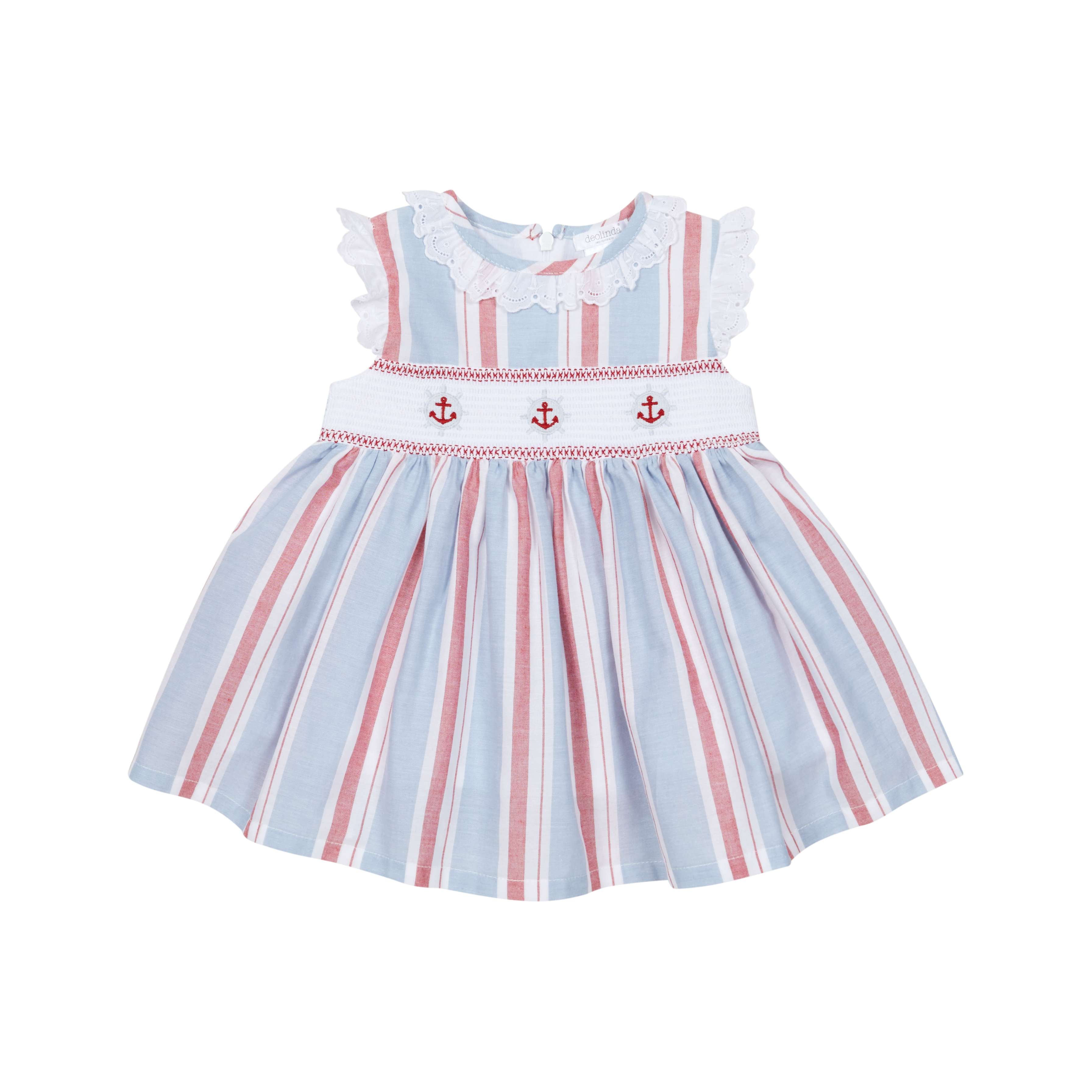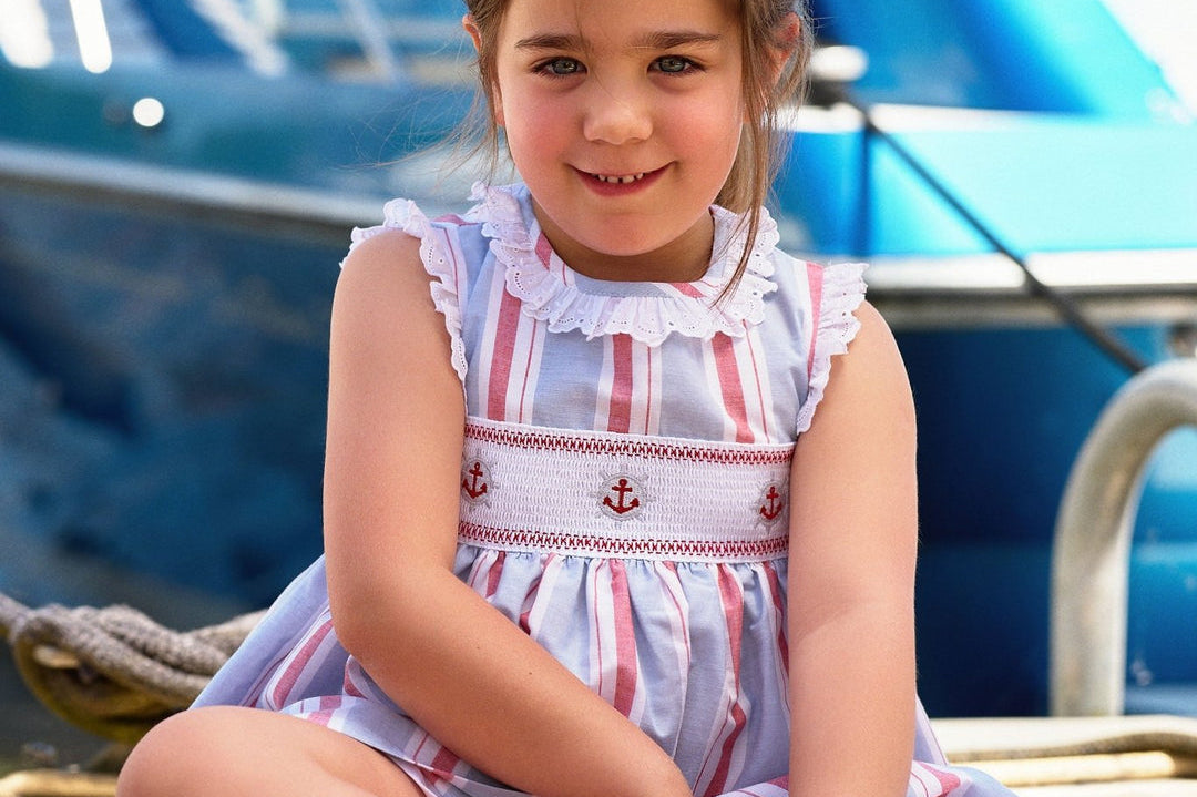 Smocked dress in muted blue, red and white stripe gives a classic seaside feel, while the delicately smocked chest is finished with embroidered red anchors for a subtle nautical touch.
