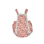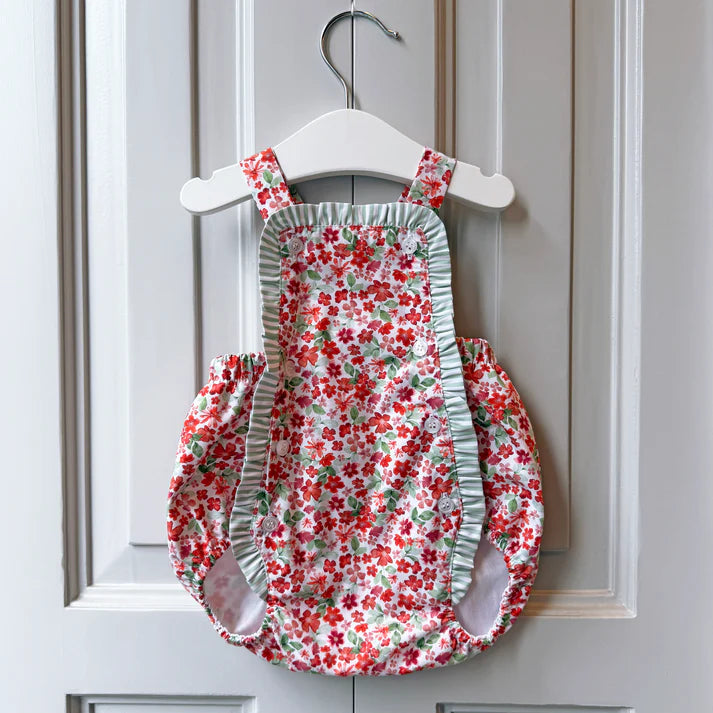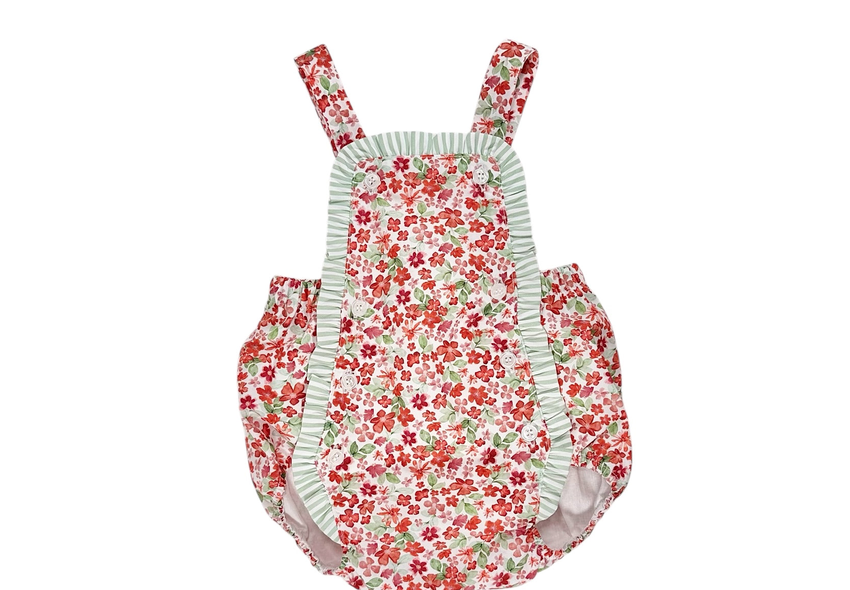 Designed with beautiful red floral fabric. It has elastic on thighs and buttons on front and bottom for easy diaper change.