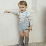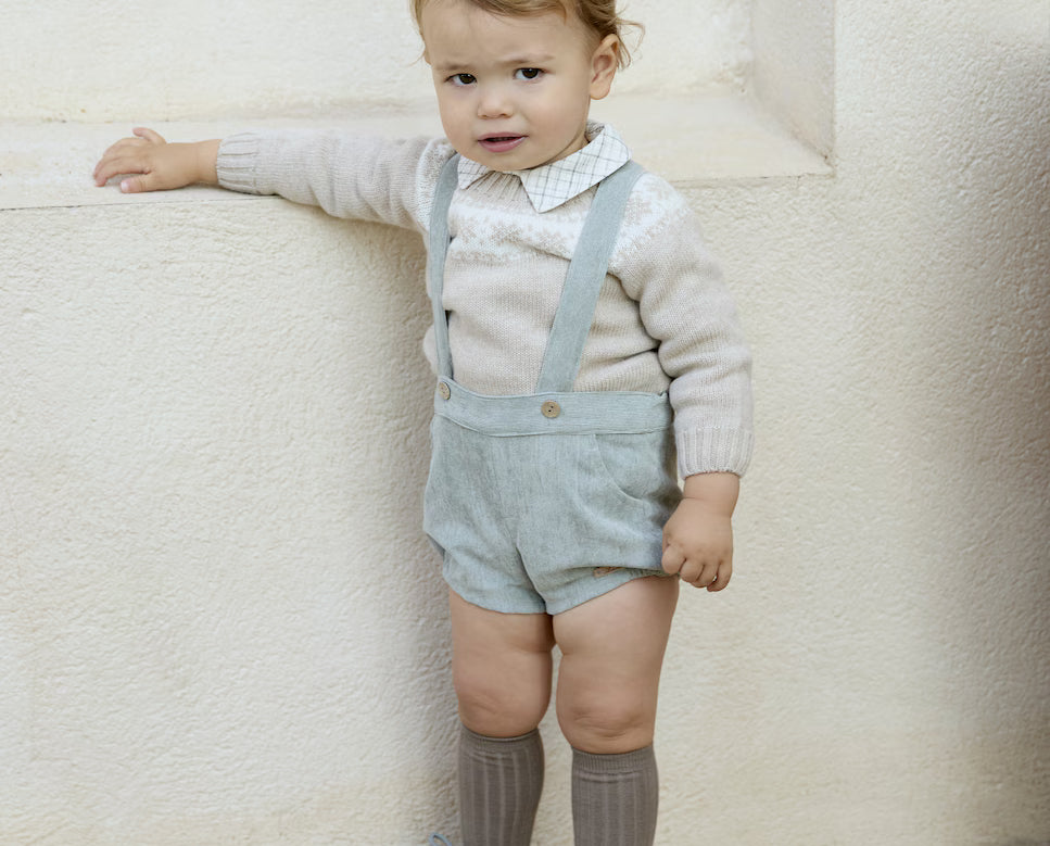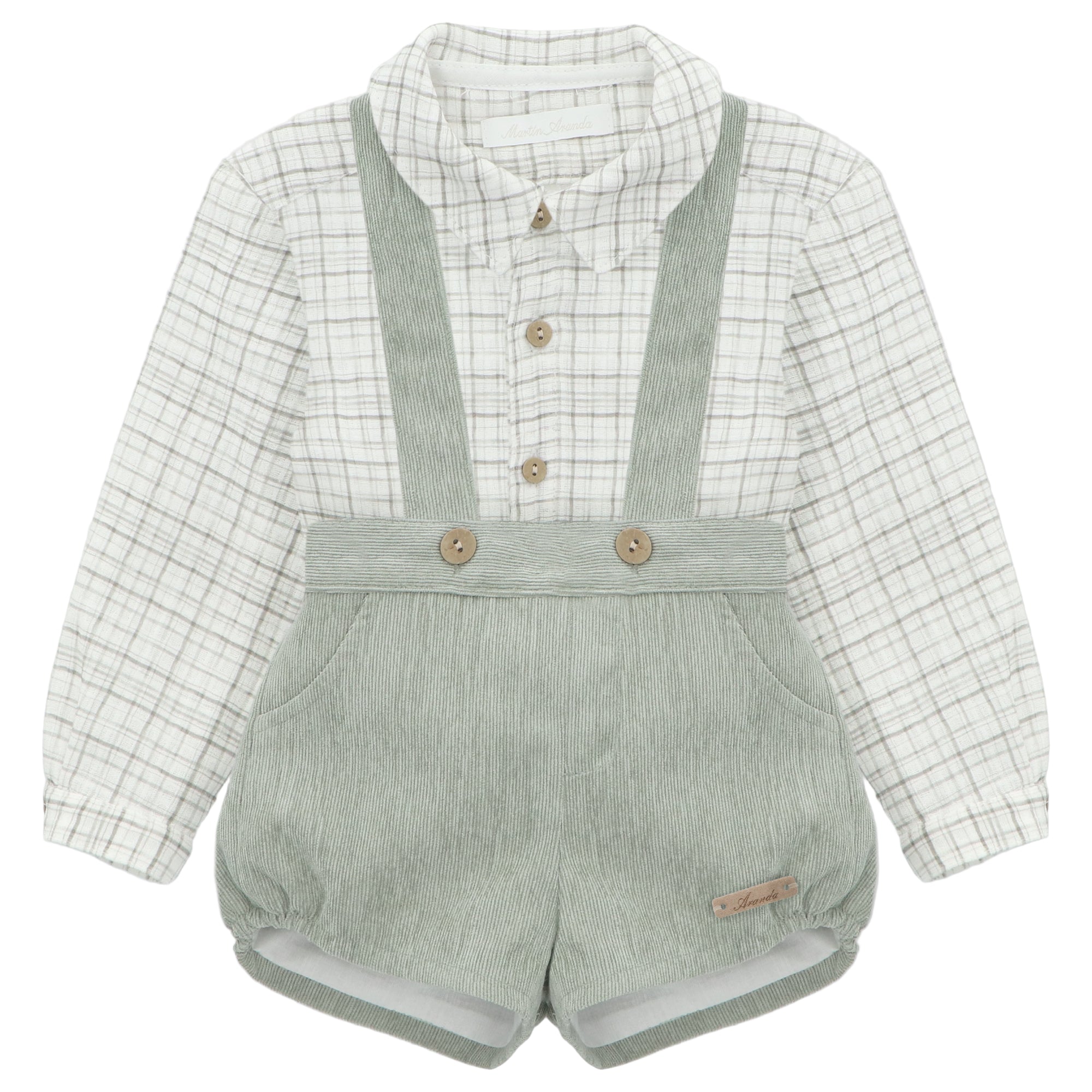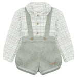 Baby set consisting of a micro-printed cotton shirt with a Peter Pan collar and micro-corduroy bloomers with suspenders, coconut buttons and a rectangular nappa patch detail, in green.