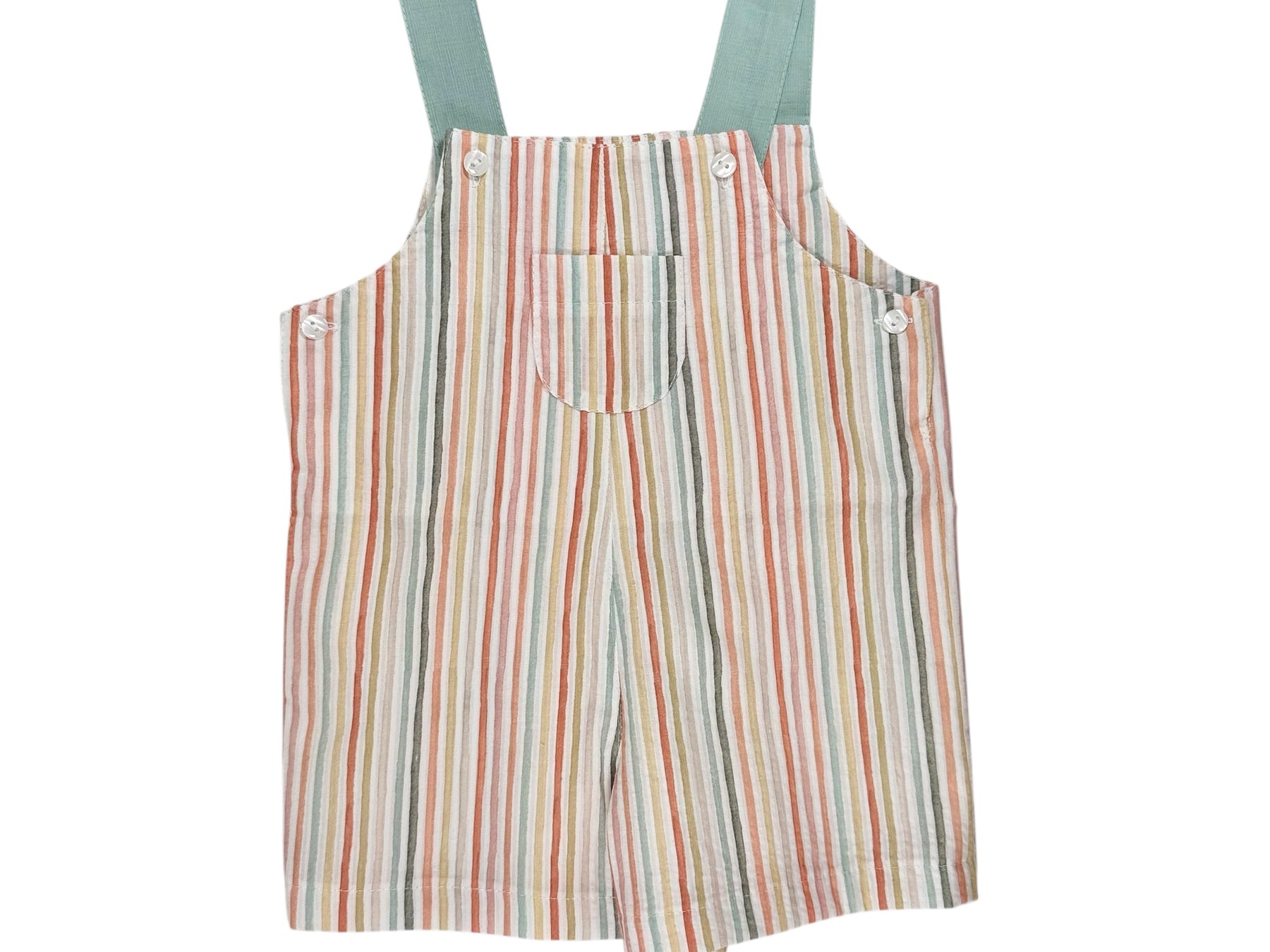 Playful and stylish short overalls featuring a colorful striped pattern and contrasting straps.