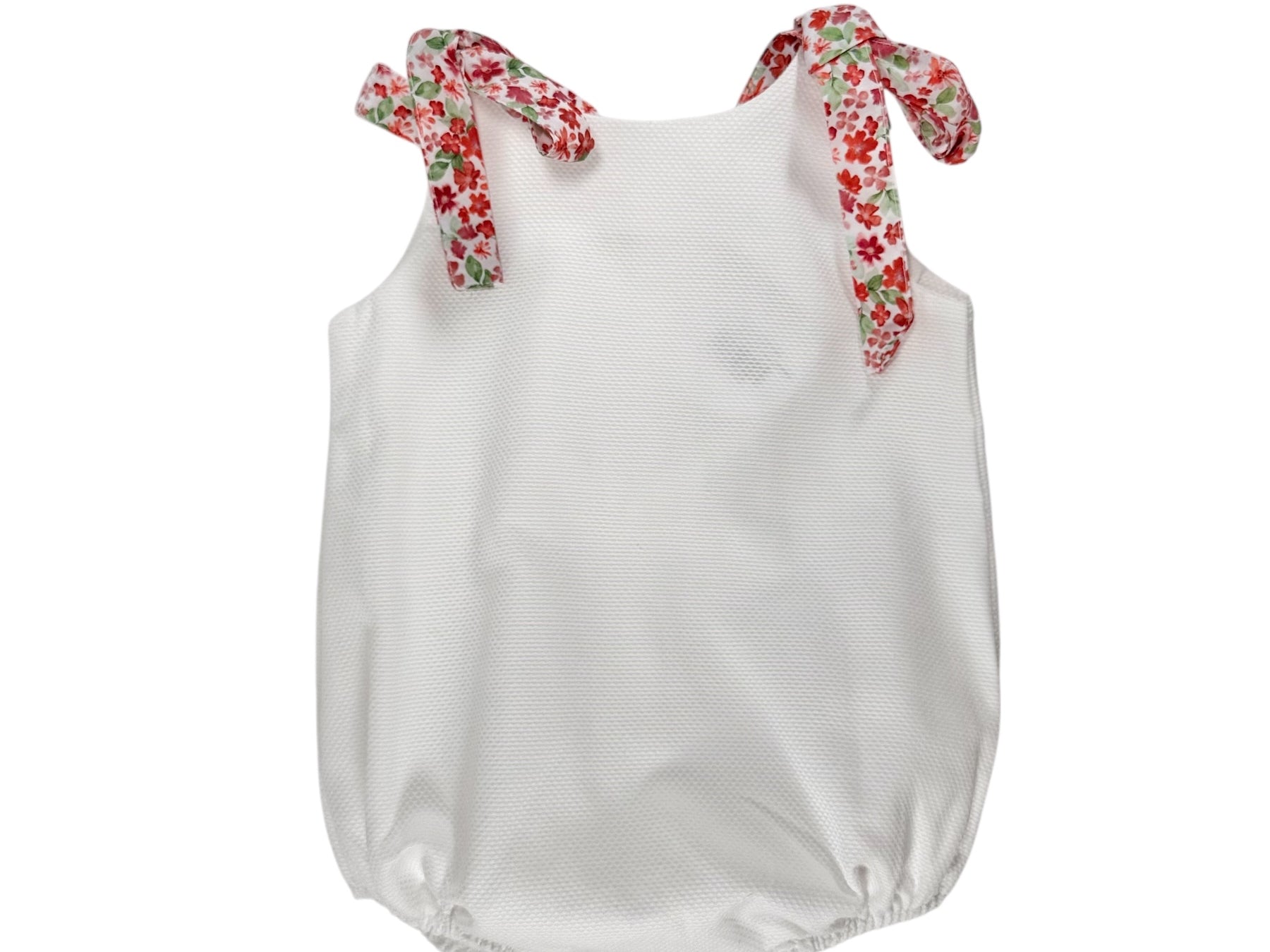 Designed with pique fabric with bows on shoulder that can be removed. Three buttons on back and bottom for easy diaper change.