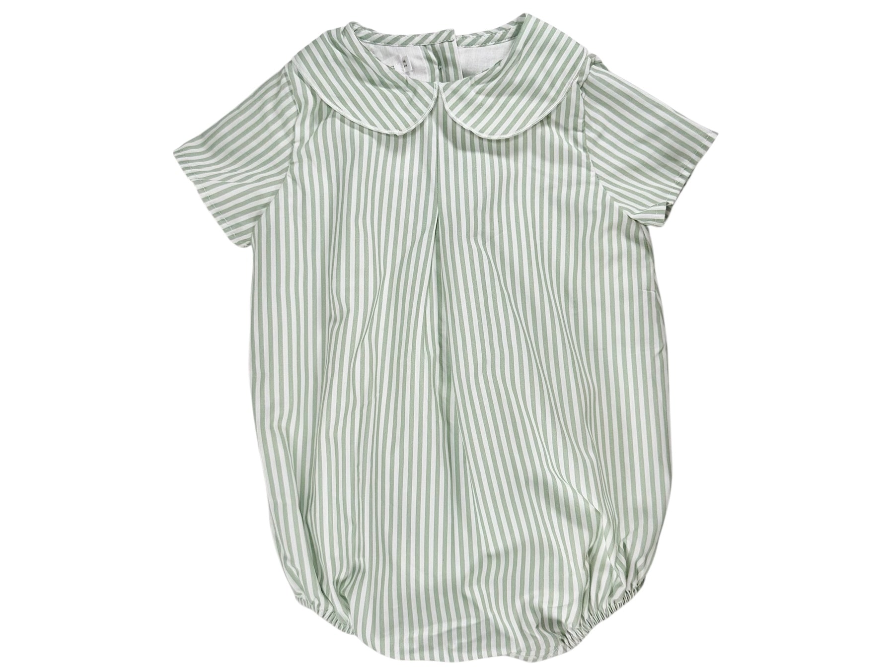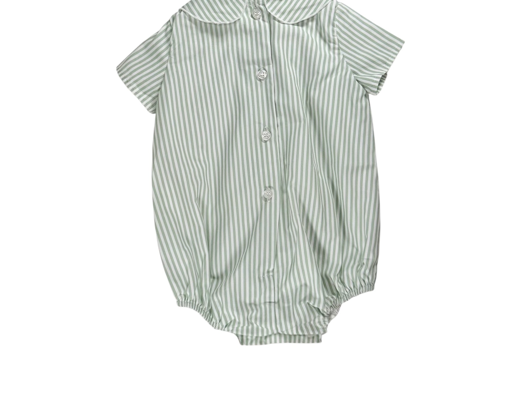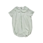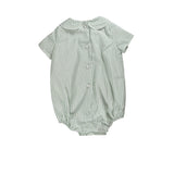 Romper with peterpan collar and buttons on bottom for easy diaper change.