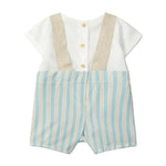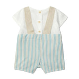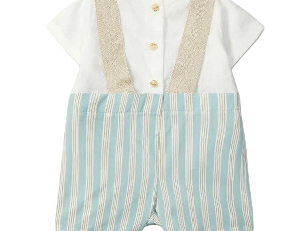 Single piece with the appearance of two. Top part in linen with decorative Laranjinha button. Dungaree shorts in 100% cotton gauze with striped print. Decorative straps and buttons. Fastens with buttons on the back and poppers between the legs. Piece designed to make dressing the baby easier