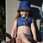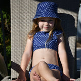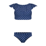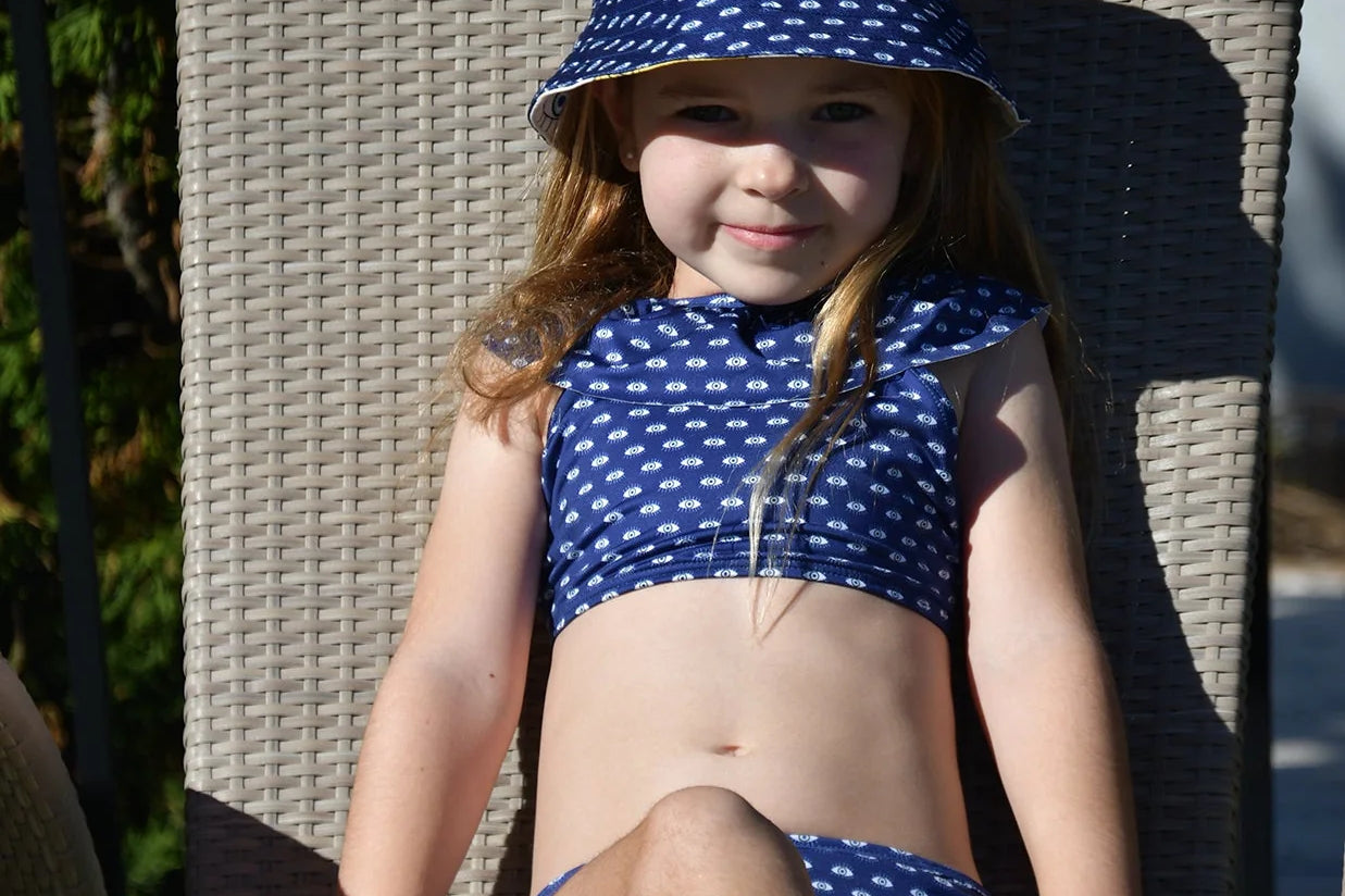 Fun two-piece swimsuit for girls with a cute crisscross design on the back of the top. Made from recycled polyester fabric with UV protection, it dries quickly and provides UPF 50+ sun protection. Made in Colombia